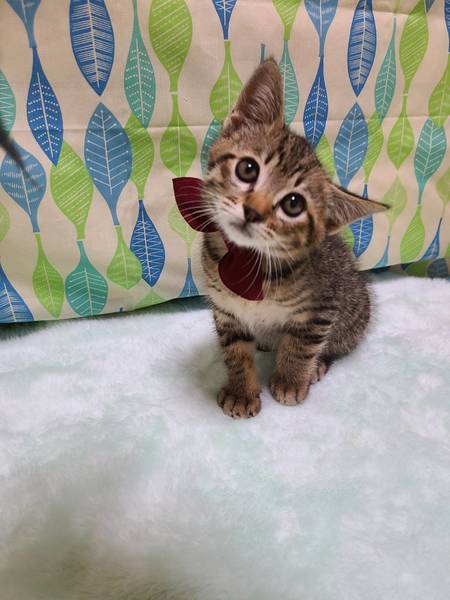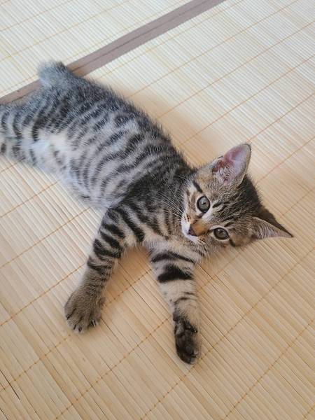 | 特徴(性格など) | ベンガル風キジトラで尻尾は短め。鍵尻尾はではありません。 性格は仔猫らしくとっても元気。食欲も旺盛で、1人遊びも上手です。 一匹での保護となったので、兄弟達とのじゃれあいで学ぶ社会勉強ができていないため、先住猫がいるお家が希望です。 |
