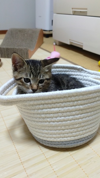 | 里親募集する理由 | 病院の駐車場に一匹でいました。辺りを探しましたが、親猫や兄弟猫は見当たりませんでした。車の往来もあるため危険と判断し保護に至りました。 | ||