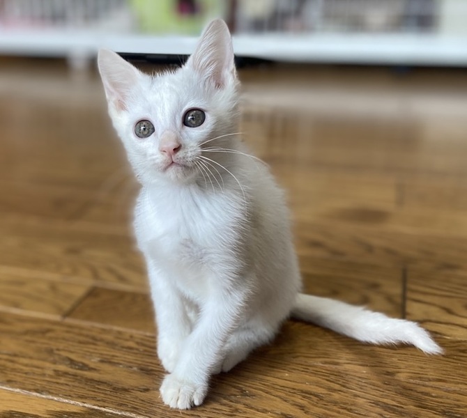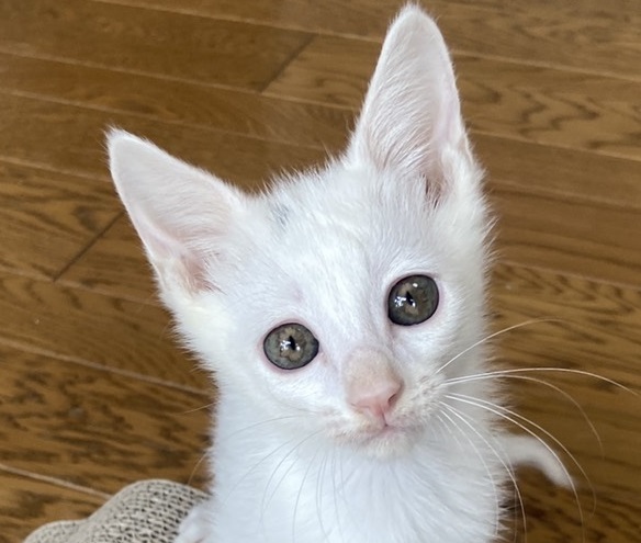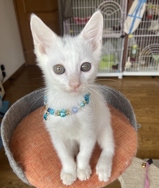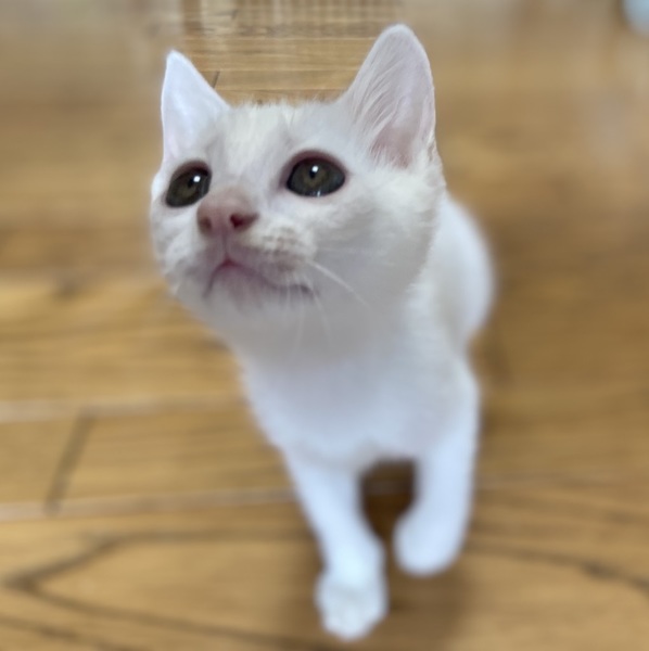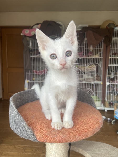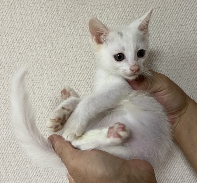 | 特徴(性格など) | 目が開くころから育てていますので人なれ抜群で兄弟でよく遊びます。しっぽはまっすぐで長くかっこいいです。頭に黒い模様がありますが、成長と共に真っ白の子になると思われます。 近況や そのほかの里親募集中の猫たちは 「サクラねこ名古屋」のブログで毎日御紹介させていただいております。 http://sakuranekonagoya.jp/ ノミダニお腹の虫は駆虫済み。エイズ白血病ウイルス検査陰性。3種混合ワクチン一回目接種済。とても健康で元気いっぱいです。マイクロチップが入っています。 |