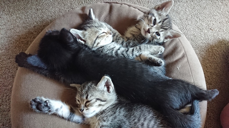 | 特徴(性格など) | キジトラのメス2匹は少し尻尾が曲がっています(他の3匹はまっすぐです)。どの子も人間にすごく慣れており、呼ぶと寄ってきたり、膝の上に上ってきたりします。6月11日現在離乳食や猫缶を食べており、トイレも覚えています。 | ||
