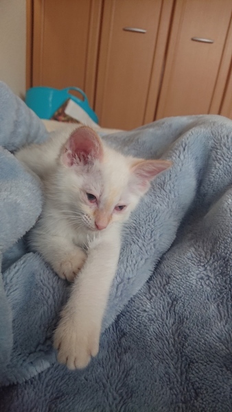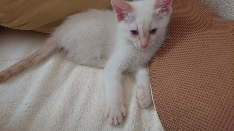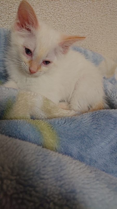 | 特徴(性格など) | 白♂ 耳としっぽがうすい茶です ヤンチャで賢いです。白でとてもきれいです。 猫風邪(ヘルペスウイルス)をひきましたが、病院で治療いたしたした。今は目薬をさしております。良くなるまで目薬をさせる方希望します。 先住猫ちゃんにうつる可能性あります。 |