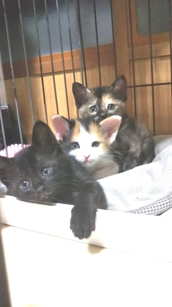 | 特徴(性格など) | 黒·三毛·サビの三姉妹 皆人慣れしていてゴロゴロ喉を鳴らす愛嬌たっぷりなとても可愛い子達です! 離乳食完了してカリカリ食べてます |