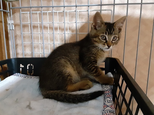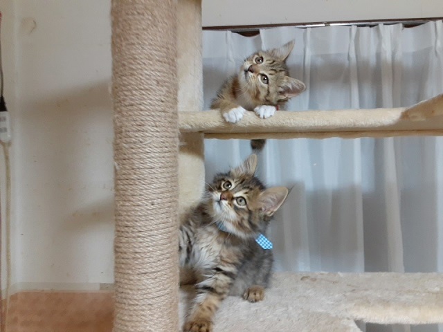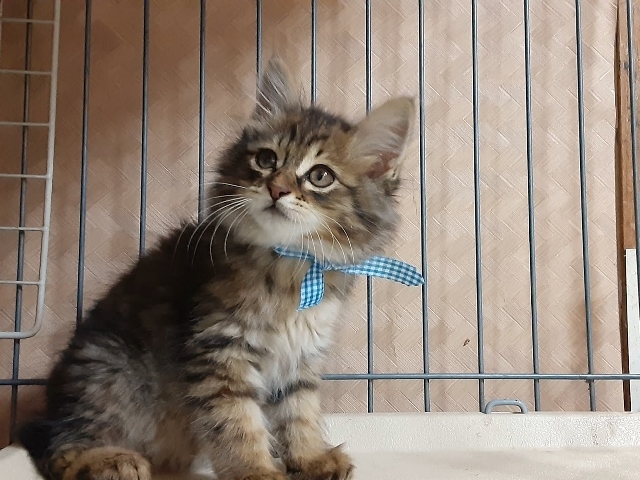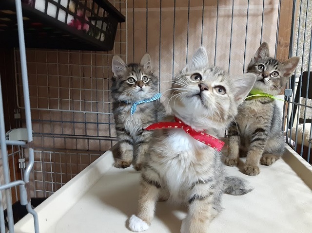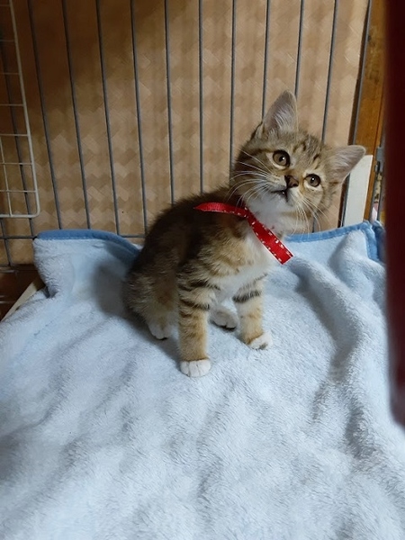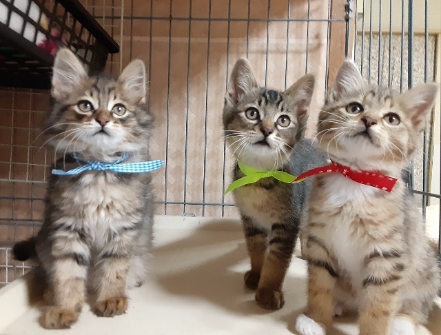 | 特徴(性格など) | 食いしん坊で好奇心旺盛、大人の猫にも物怖じしない元気な3兄妹です。 【青色リボン】 ロビン君 半長毛 男の子 カギしっぽ モフモフ毛並、穏やかで従順、人馴れしています。 ごはんの前は大きな声で 『早く』と催促します 【赤リボン】 ノンちゃん 白タビ 女の子 カギしっぽ 女の子らしく控え目なところもありますが、遊ぶ時は活発で走り・キャットタワーの上までよじ登り、 おもちゃにも夢中になります。 【黄緑リボン】 ポム君 男の子 まっすぐしっぽ 兄妹の中で身体が一番大きく、手も太いので大柄な子になりそうです。 黒にベージュ色のさし毛でめずらしい毛並です、 元気満々の子ですが、爆睡中はさわっても起きません。 ワクチン :1回済 エイズ・白血病検査 : 陰性 (青リボンの子で検査) ノミ駆除 : 済 検便 : 済 健康状態良好 食欲旺盛 トイレ : しつけ済 仲のよい兄妹なので、出来れば2匹一緒にお願いしたいのですが、1匹でもかまいません。 小さい子なので在宅時間の多い方を希望します。 お問い合わせの際は、家族構成(年齢)・在宅時間・お住まいのペット飼育の不可・飼育経験を お知らせ願います。 |