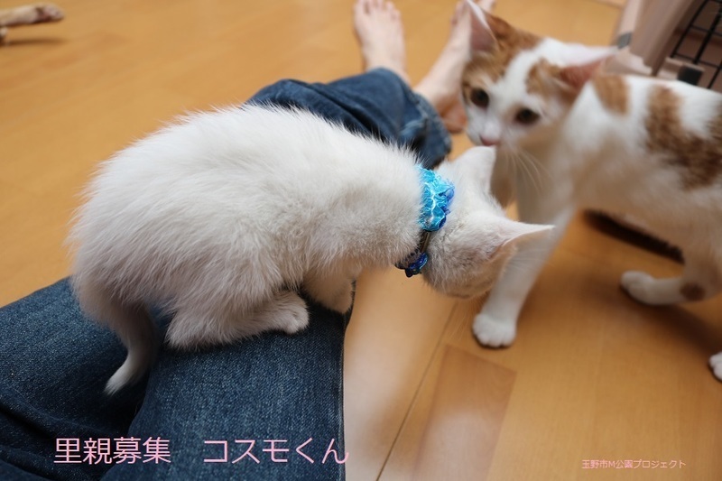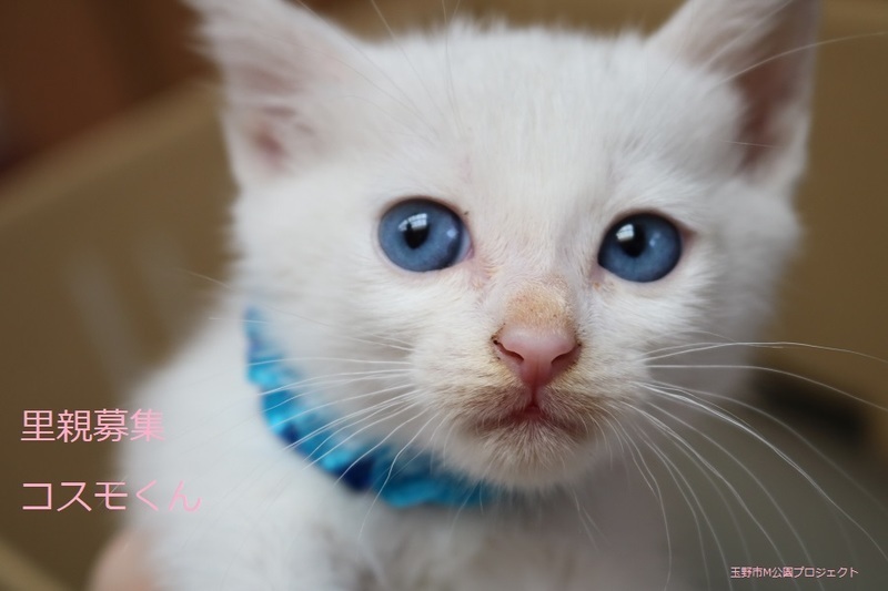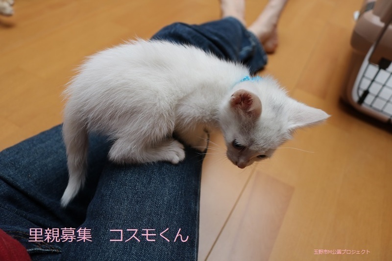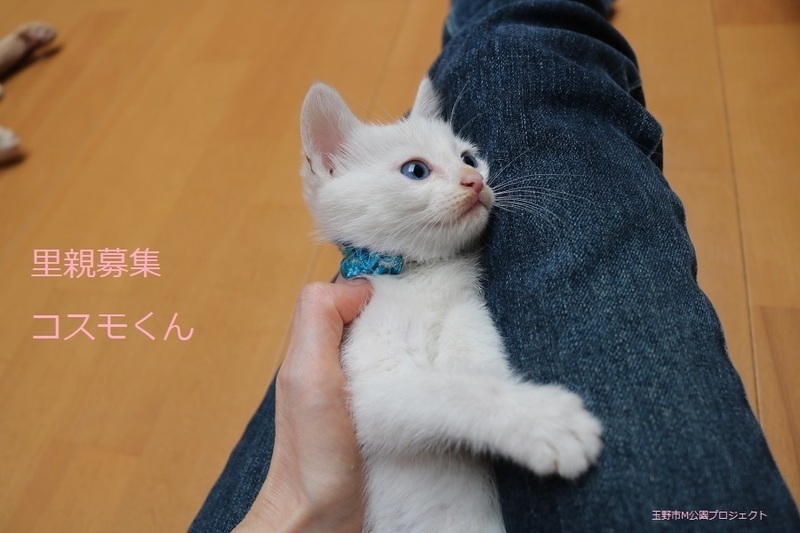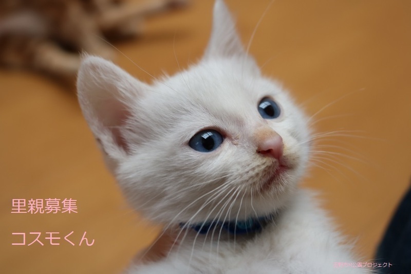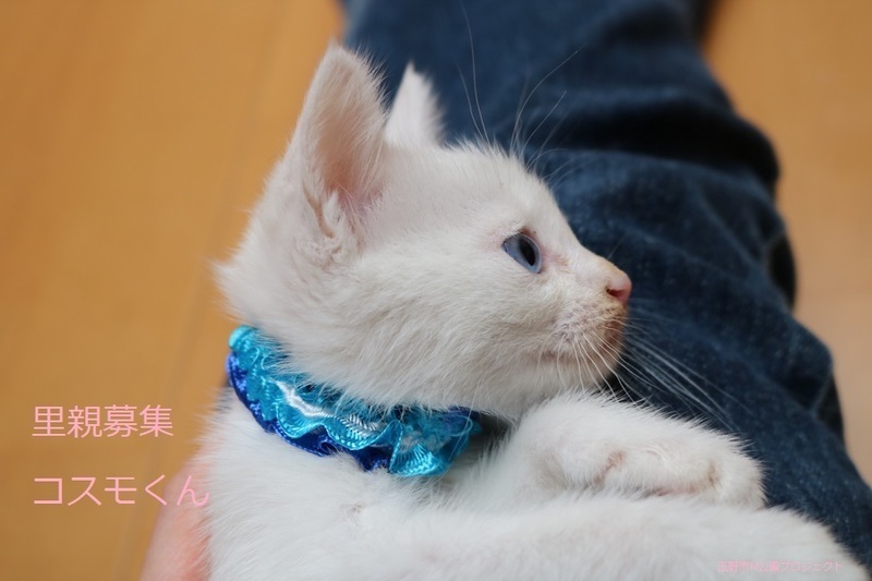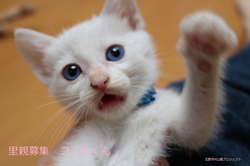 | 特徴(性格など) | 白仔猫、男の子、仮名:コスモくん 推定生後一か月半くらい(獣医師推定)、体重:420g(6/14現在) 健康診断済み、フロントラインスプレー済み トイレしつけ済み、 血液検査、ワクチン接種は、体重が1kgになり次第実施します。 ブルーアイで、きれいな白猫です。キトンキャップ有り。 はじめは人見知りしますが、慣れたら活発に遊びます。 6/30、ウイルス検査-エイズ・白血病-共に陰性。 6/30、初回三種混合ワクチン接種。 7/7、ブロードライン済。 |