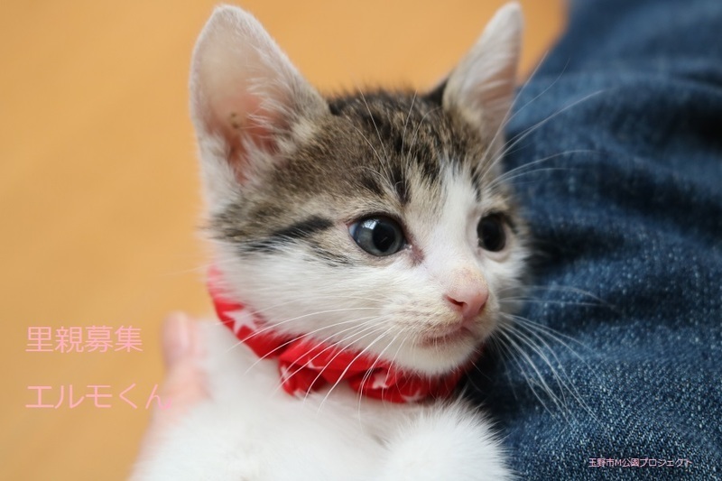 | 特徴(性格など) | キジ白仔猫、男の子、仮名:エルモくん 推定生後一か月半くらい(獣医師推定)、体重:370g(6/14現在) 健康診断済み、フロントラインスプレー済み トイレしつけ済み、 血液検査、ワクチン接種は、体重が1kgになり次第実施します。 可愛らしいお顔です。はじめは人見知りしますが、慣れたら活発に遊びます。 6/30、ウイルス検査-エイズ・白血病-共に陰性(兄弟代表でコスモくんで実施)。 6/30、初回三種混合ワクチン接種。 7/7、ブロードライン済。 7/28、三種混合ワクチン追加接種。 |