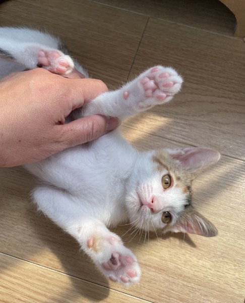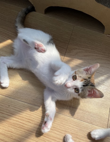 | 特徴(性格など) | キレイな三毛柄の女の子。とても美しい猫さんに成長すると思います。 甘えんぼさんで、すぐゴロゴロ言ってくれます。 元気に走り回って遊びます。 |