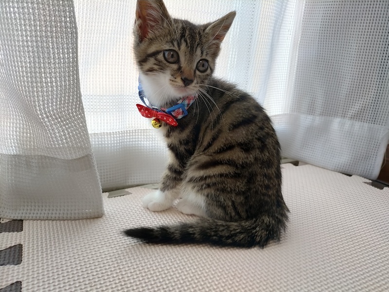 | 特徴(性格など) | 白靴下に白手袋、きれいな縞の美人さんです。甘えんぼで、保護当日からゴロゴロ喉を鳴らしてました。 猫じゃらし、ボール、遊ぶの大好き。トイレも覚えました!離乳していて、ドライフード、ウェットフードもよく食べます。 あいねこさん譲渡会に参加します!会いに来てください。 |