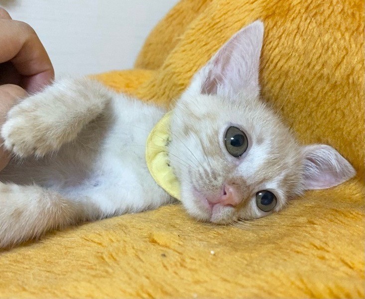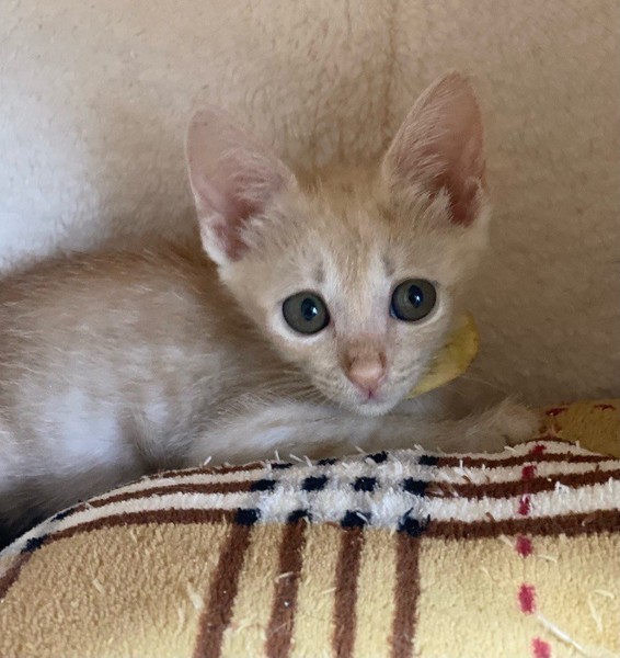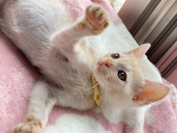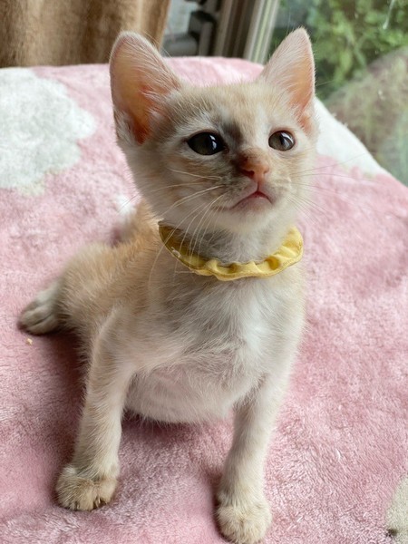 | 特徴(性格など) | 猫じゃらし大好き♡「カルボナーラ」ちゃん❤ うるうるお目々で見つめる甘えっコ♪ 現在、ドライフードを24時間の置き餌として栄養補給、水分補給のため一日4回パウチを与えています。 <推定誕生日:5月始め> |