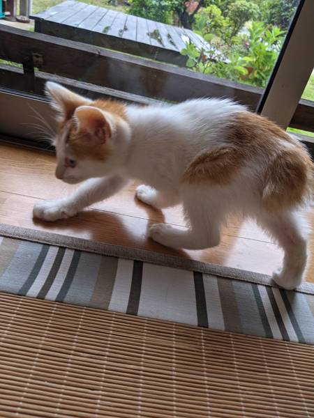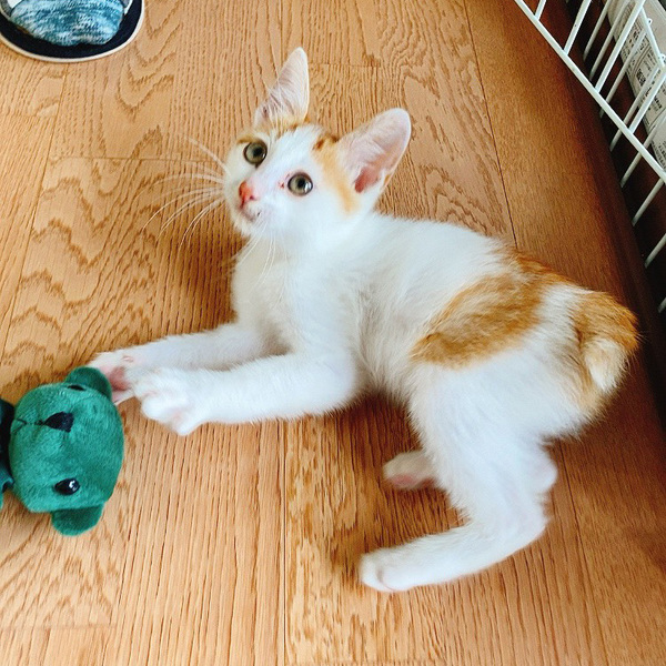 | 特徴(性格など) | 茶白のオスです。尻尾が短くて良く人馴れした可愛い子猫です。元気食欲あり。ノミダニ駆除済み。 | ||
