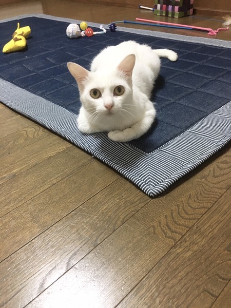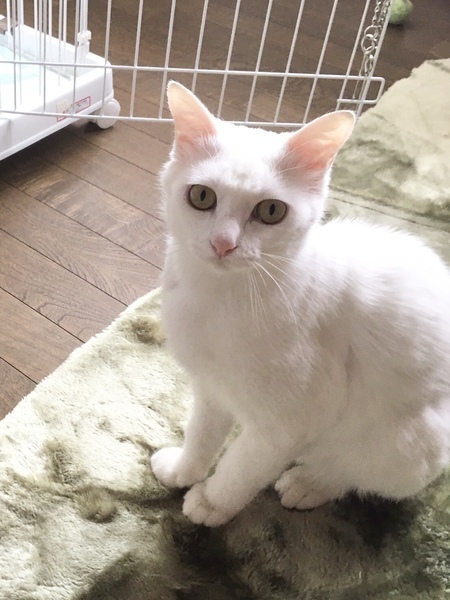| 里親募集する理由 | 岡山駅近辺の交通量の大変多い場所で、近所の餌やりさんから、約1年ゴハンをもらっていましたが、不衛生な環境のせいか、あるいはストレスからか、皮膚の状態がとても悪くなっていたので、急遽保護いたしました。保護した当初は、それまで怯えながら生きてきた為だと思われますが、いつも体高を低くして小刻みに震えているのが、本当に不憫でした。今ではおもちゃで一人遊びが出来るほどになり、仔猫らしくなっています。。 | ||