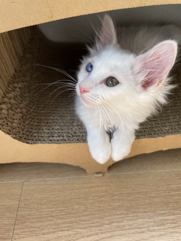 | 特徴(性格など) | 少し長毛でオッドアイのキレイな女の子です。抱っこ好きで、すぐゴロゴロ言ってくれて可愛いです。やや大人しい方ですが、おもちゃ大好きです。 |