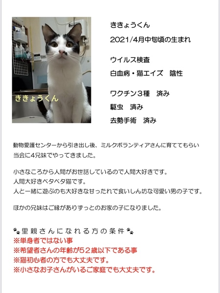 | その他(譲渡条件など) | ※単身者ではない事 ※希望者さんの年齢が52歳以下である事 里親希望者様には猫ちゃんに面会に来て頂いています。 アンケートもお願いしています。 アンケートは事前にメールで送って面会当日にお持ち頂く事も可能です。 その他、譲渡金やトライアルなどの詳細はメールにてお問い合わせください。 インスタからの問い合わせも可能です。 インスタID nekonokai_2016 よろしくお願いいたします。 |
