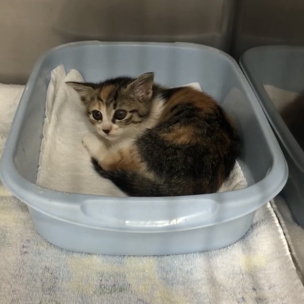 | 特徴(性格など) | 三毛トラちゃんです。 活発な性格の女の子で、入院中のケージ内では他に遊ぶものがない為、お水で遊んでしまうみたいです。 よくじゃれます。触ろうとすると少し緊張している時もありますが、撫でたり抱っこすることができます。 |