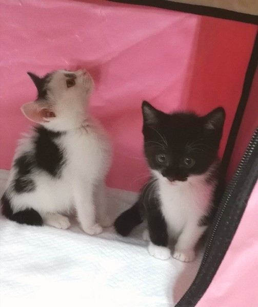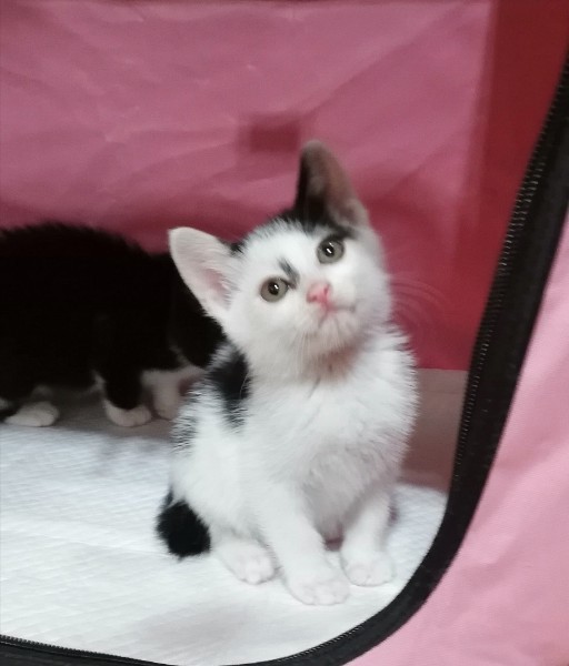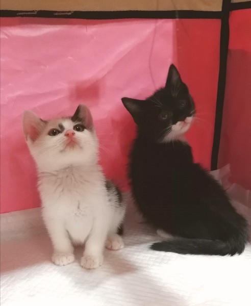 | 特徴(性格など) | 生後1ヶ月半ちょっとになる男の子の兄弟です。 白黒の方は少しおとなしめで、ききわけがいい子です。 黒白の方はなかなかのやんちゃっ子です。 2匹とも十分に人馴れしており、どったんばったん絡み合って遊ぶ様子が可愛らしく見飽きることがありません。 ・エイズ·白血病ウイルス陰性 ・3種混合ワクチン1回目接種済み ・検便チェック済み ・レボリューションスポット済み |