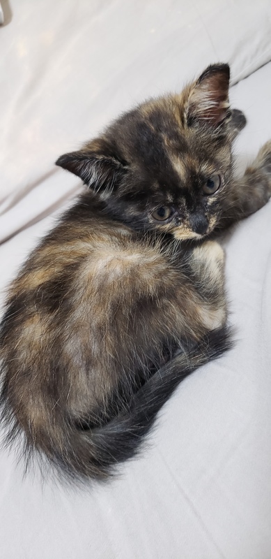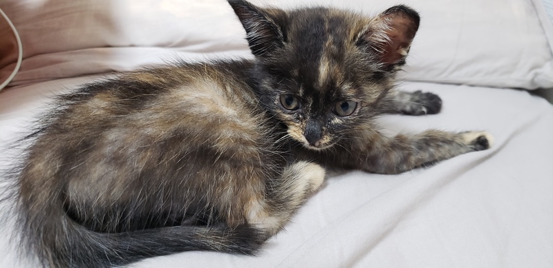 | 特徴(性格など) | 【色柄】 ・生後3ヶ月のサビ猫の仔猫(メス)です。 【性格】 ・性格はツンデレでまだ人に慣れていませんが、可愛らしい顔立ちです。 ・抱っこが苦手で構いすぎると機嫌が悪くなります。 ・1人にしても鳴くことはなく、マイペースで遊ぶ猫らしい性格です。 【健康状態】 ・後遺症が2つあります。 ・目が他の猫よりも見えにくいことです。しかし、紐を目の前に出すと追いかけたり、1人で走り回ったりしています。 ・飼っていて「目が見えていない」と思ったことはありませんが、高い場所には登れません。 ・ご飯もトイレも普通に行います。 ・保護直後は、突発で短時間、痙攣を起こすことがありましたが、頻繁には出ないので、病院からは大丈夫と言われており、病院での治療は完治済みです。 ・頻繁に痙攣がでる場合は、診察が必要になります。 ・病院治療以降、1ヶ月以上痙攣は出ていません。 |