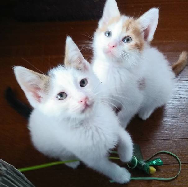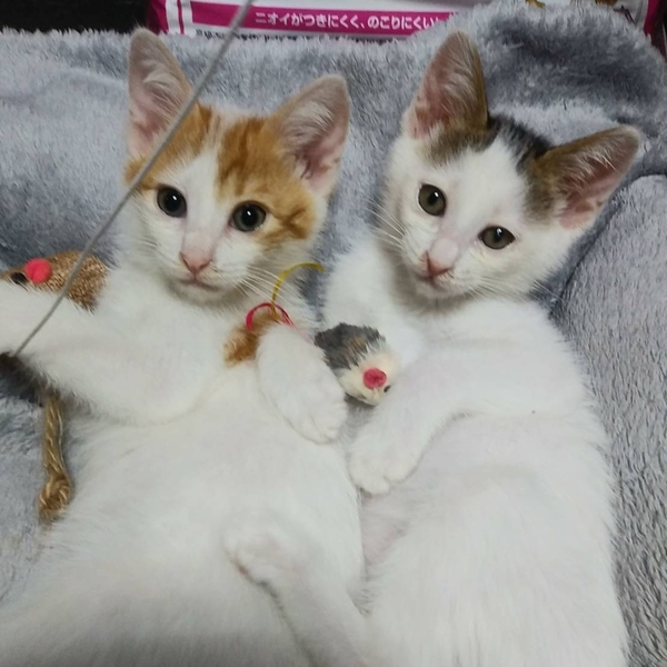 | 里親募集する理由 | 運送会社の敷地のすみに母猫と子猫三匹を見掛けるようになったと連絡をもらい保護を決め母猫は避妊すべく動いていました。 子猫たちは皆猫風邪で目が塞がるくらい酷いものでしたので少しでも早い保護をと思っていましたが保護に向かった前の日にサビ猫ちゃんはカラスによって命を落とす結果になりました。 保護した二匹は毎日のお湯洗いと目薬、イチゴ味のお薬を頑張り美猫に生まれ変わりました。ご飯もモリモリ良く食べ、良く遊び寝て元気に飛び回ってます。 |