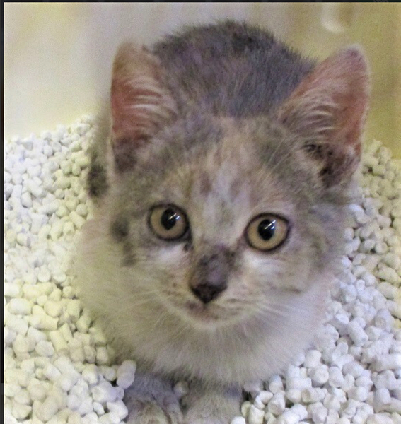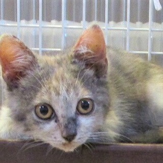 | 特徴(性格など) | 気立てはとっても良く、人にも良く慣れていて甘えん坊の姉妹猫の一匹です。 珍しい模様で、ロシアンブルーのようなグレーの入った三毛ちゃんです。 |