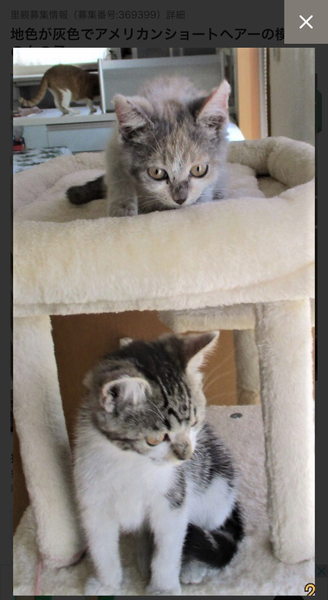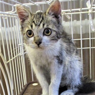 | 特徴(性格など) | 気立てはとっても良く、人にも良く慣れていて甘えん坊の姉妹猫の一匹です。 アメリカンショートヘアのようなグレーの模様が入った猫です。 |