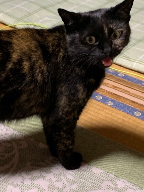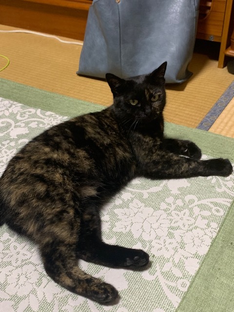 | 特徴(性格など) | 名前はクロちゃんですが、黒と茶色の「さび猫」です。しっぽが途中で切れているのがかわいいです。性格は怖がりですが、人なつこくて、布団に入ってきます。ちょっとでも人に触れていたいらしく、寄りかかってきます。経産婦(猫)で、子育ての様子をずっと見てきましたが、一所懸命に世話をして、とてもよい母猫でした。現在は避妊手術をしてあります。 |