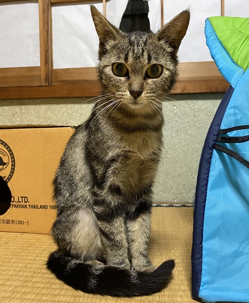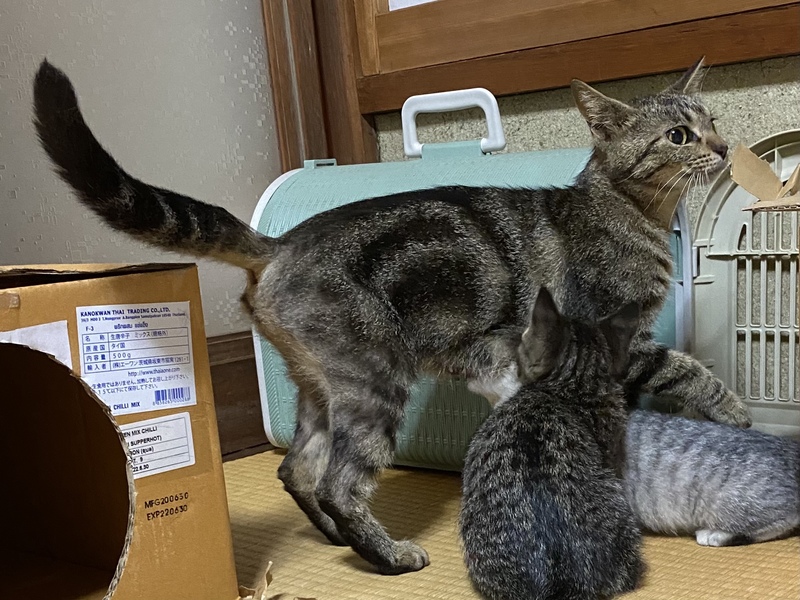 | 特徴(性格など) | 渦巻模様のキジトラ、ブラウンクラシックタビーの雑種です。 小柄で体重は3kgほどです。 ノミダニ寄生虫の駆虫済みです。 避妊手術も終えました。 おしり周りから後脚の後ろ側にかけて毛が短くなっています。 獣医さんによると、ノミがいた時に痒くて舐めすぎてしまったのではないか、とのことでした。 皮膚病などではないということです。 甘えて撫でてもらうのが好きです。 写真は最後の2枚を除いて最近のものです。 最後の2枚は出産してすぐ(5月中旬)でまだ少しふっくらしていた頃のものです。 今は授乳と育児で痩せてしまいましたが、育児がひと段落すればまた少しふっくらするのではないかと思います。 インスタグラムに動画や写真を載せています。 @chiriri_4anak |