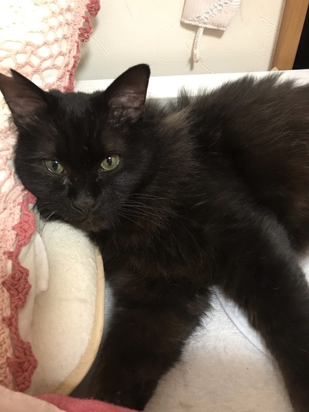 | 特徴(性格など) | ツヤツヤの黒長毛です。大人猫は苦手ですが人と子猫には溢れるばかりの愛情を与えてくれる愛され猫です。 | ||