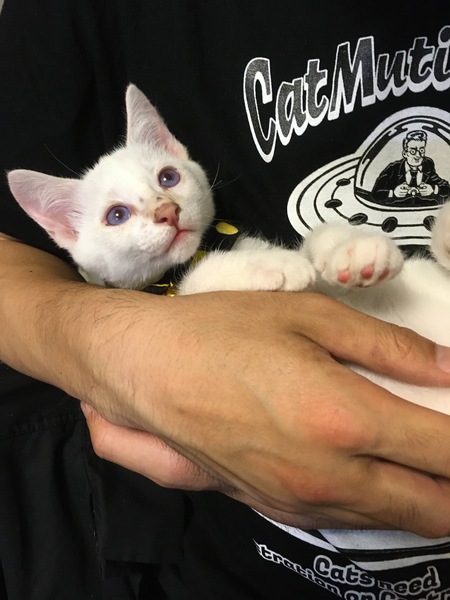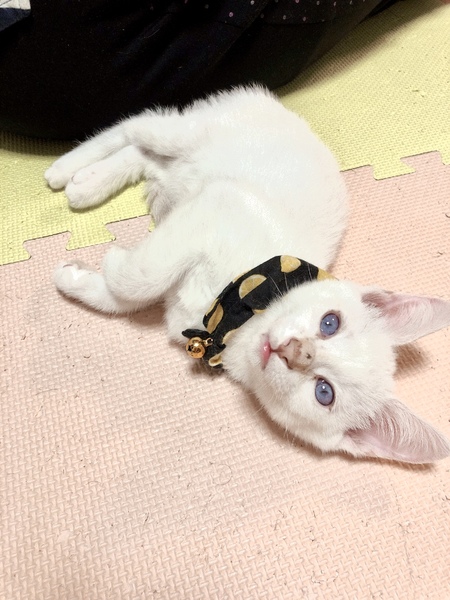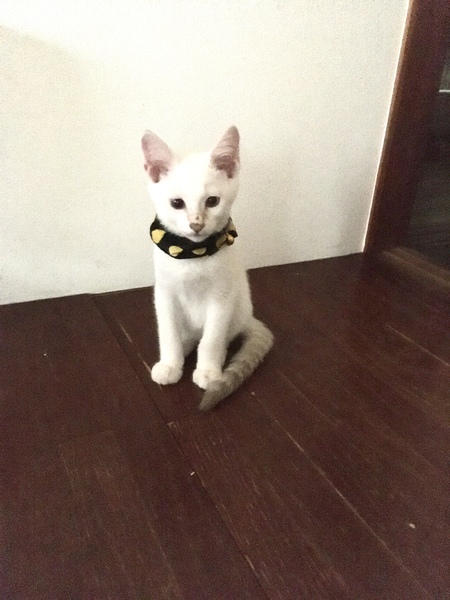 | 特徴(性格など) | 甘えたで、ゴロゴロ言って付いてきます。 撫でられるの大好きです。 全体白で、尻尾に少し模様が有ります。 |