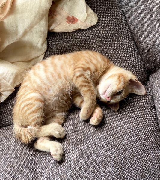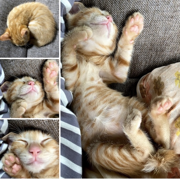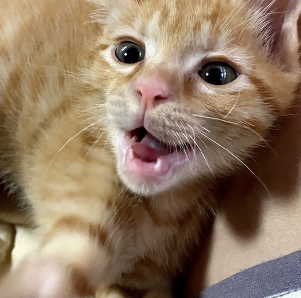 | 特徴(性格など) | ポコちゃんと言います。茶トラのやんちゃな男の子です。生後3日目に譲渡していただいて、ミルクから大切に育てて参りました。犬3匹が一緒におりましたので、犬は怖がりません。格闘ごっこします。今が一番やんちゃ盛り、可愛い盛りです。猫じゃらし大好きです。よく遊び、よく寝ます。気が強い方だと思います。人間にも慣れておりますので、遊び疲れたら自分から近寄って来て、必ず側で寝ます。たまに膝に乗って来てそのまま寝てしまいます。あまり鳴きません。お風呂はまだ小さいので、キッチンで洗っていました。大人しくしていました。ドライヤーもまだ怖がらないです。掃除機はちょっと苦手です。食べ物を何でも狙います。とにかく可愛いです。しっぽは短く、かぎしっぽです。チャームポイントです。 | ||