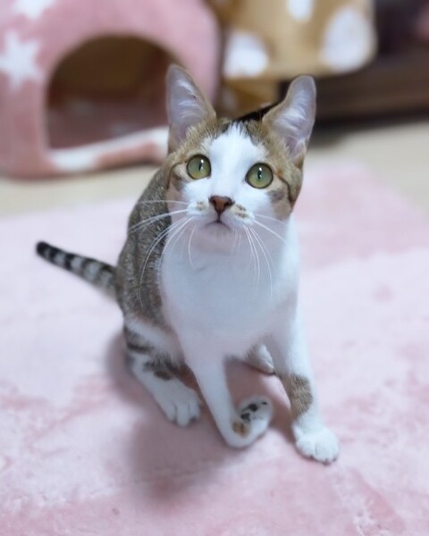 | 特徴(性格など) | 保護された時点で前足を引きずっていたのですぐ病院へ行きました。脳性麻痺のようで、右前足がだらーんとして動かず、右目の黒目も大きくならないそうで、痛覚もないそうです。 ステロイドで治療をして様子を見ていくことになりましたが、この先良くなるのか、病院の先生もわからないそうです。 障害がありますが、いたって本人は元気で、トイレで排泄もできますし、走り回って遊んでいます。25センチくらいの高さもジャンプして登れます☆ 日常生活に支障はありません。 目が見えにくいからか触ると一瞬シャーっといいますが、すぐに触られるのを喜んでゴロゴロ言い出します。抱っこも大好きです♪ そんないとちゃんですが、障害があってもかわいがってくださる方、治療も継続してくださる方、どうかよろしくお願いいたします。 |