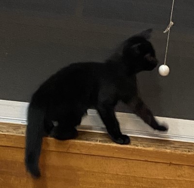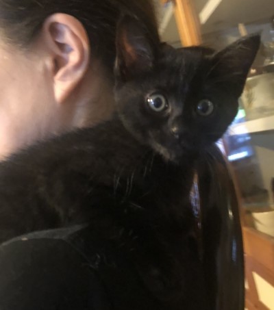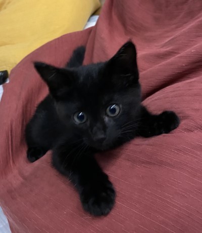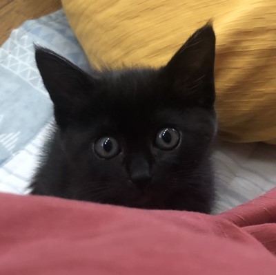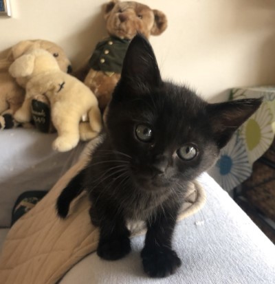 | 里親募集する理由 | 6月中旬の梅雨の晴れ間、あるお宅の庭で一晩中子猫の鳴き声がしていました。翌朝になってから庭の隅っこで見つかったのは、全身真っ黒な小さな子猫。お母さん猫とはぐれてしまったのか、ひとりぼっちで不安そうに鳴いていて、捕まえる際に少し威嚇はしたようですが、すぐにおとなしくなって、そのうちお爺さんの横でスヤスヤ眠りはじめたそうです。一晩中鳴き続けて疲れ果てていたのでしょう。 当協会に保護依頼の連絡が入ったために引き取りに行き、取り急ぎ動物病院で健康診断を受けました。小ぶりで少し痩せてはいましたが、特に悪いところは無く、直ぐに元気も回復。今は一時預かりボランティアさんの家中を走り回って元気イッパイに遊んでいます。 |