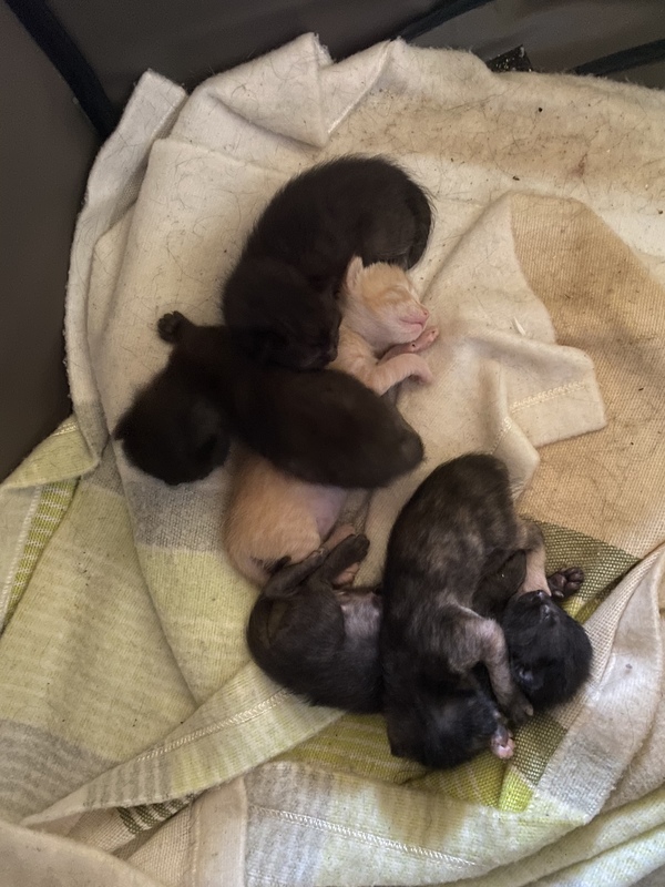 | 特徴(性格など) | 茶トラ 1匹 黒猫 3匹 サビ猫 1匹 サビ猫ちゃんは、一番小柄ですが、一番元気よく活発に動き回ってます‼︎ 他の子も、兄妹で寄り添って寝たり すくすくと育っています⭐︎ |