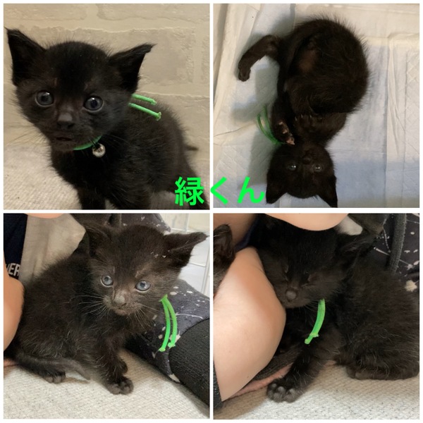 | 特徴(性格など) | 健康診断、ノミダニ駆除、虫下し2回、検便済み。 ワクチン1回 カリカリフード食べます☆ 生後3週ほどで保護しミルクで育てました。 5匹ともすぐに人の所に集まってきて膝に乗ってくる甘えん坊です(*^ω^*) 首輪が緑色の緑くん☆ 元気で活発♪人が大好き♪抱っこ大好き♪甘えん坊の兄妹の中でも1番ゴロゴロ甘えん坊です! ブログに保護からの様子を載せています☆ https://ameblo.jp/meruchobimo/entry-12678274603.html 7/4知多市旭公園体育館2階10:30〜12:00猫の譲渡会が行われます☆ |