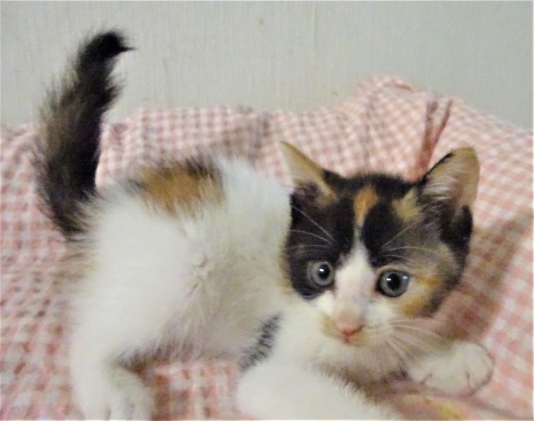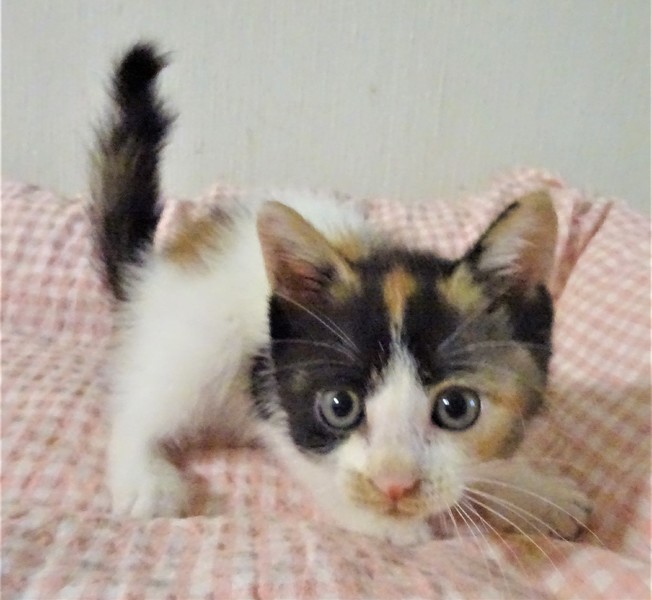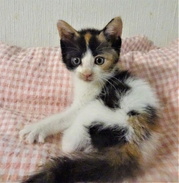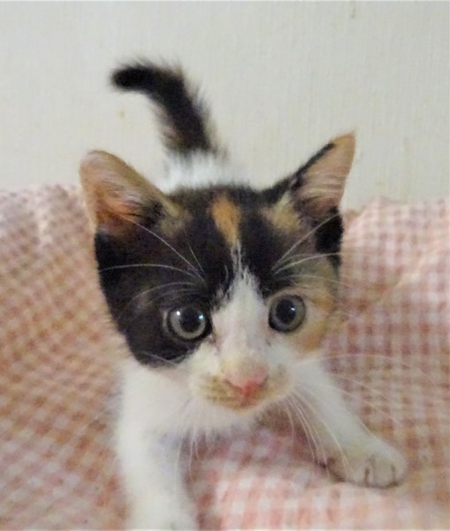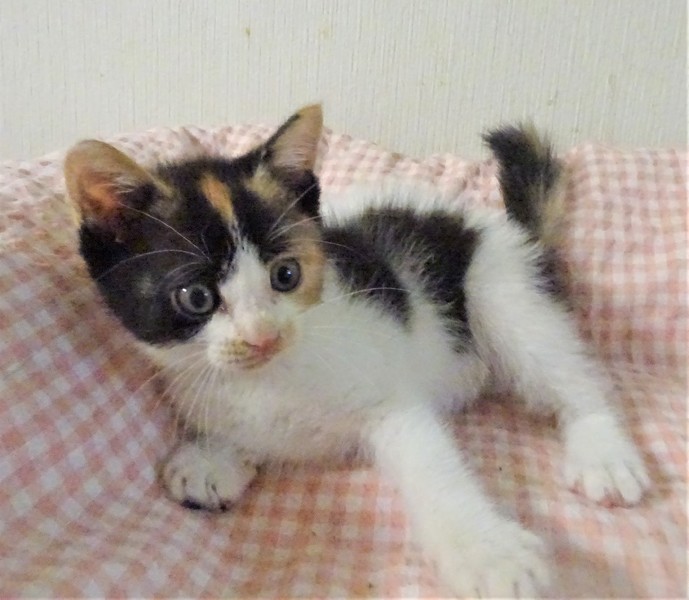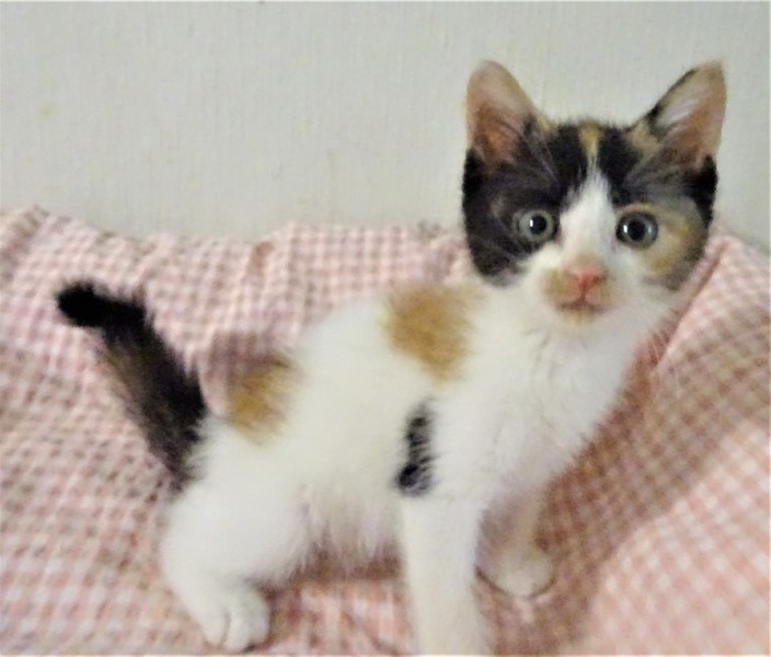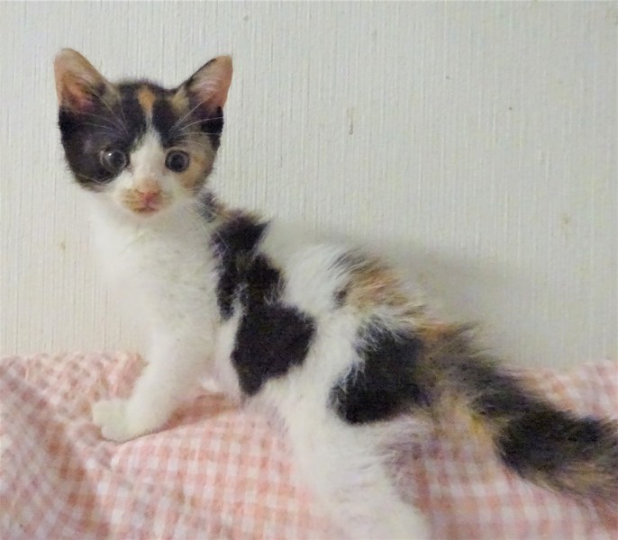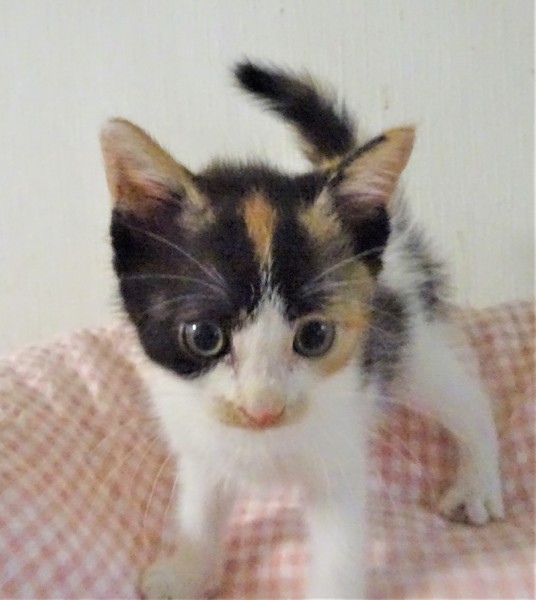 | 特徴(性格など) | 仮名: ミカちゃん(メス) 毛色: オーソドックスな三毛。 性格: まだ小さいので個性ははっきりしませんが、人には馴れていて威嚇なく抱っこ出来ます。多分、活発で元気な女の子ではないかと思います。大人猫との相性はまだわかっていません。 じゃらしにも少し反応するようになりました。兄弟がなく、一人なので、優しい先住猫がいるお家でも良いと思います。 まだ小さいので見守りが必要なので、留守番時間の短いお家でお願いします。 ワクチンは未接種ですが、生後2か月となる1週間以内に接種予定です。 |