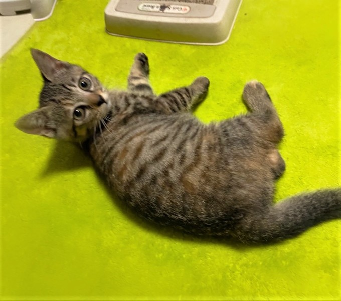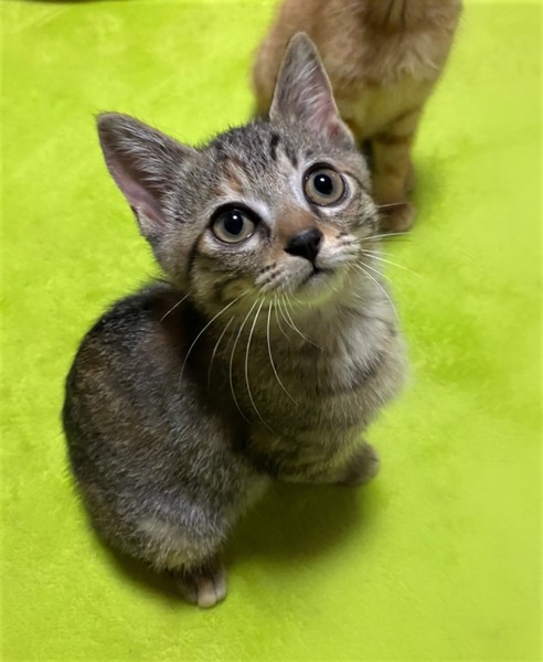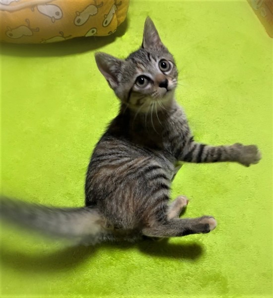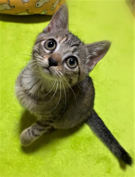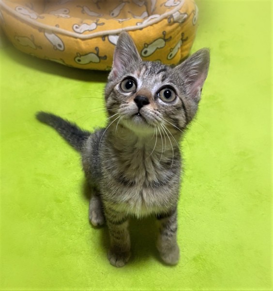 | 特徴(性格など) | 大きなくりくり目・しましま+ミケの女の子 環境に慣れるまで数日必要です。 心をひらくと、元気な甘えん坊になります。 掃除機をかけていると、物陰からこちらを狙い通りすがりにぺちぺちとパンチ 抱っこしようとするとぴゅーっと走って行く→眠たくなるといつの間にかぴったりくっついていたりします。 自由な甘えん坊さんです。 |