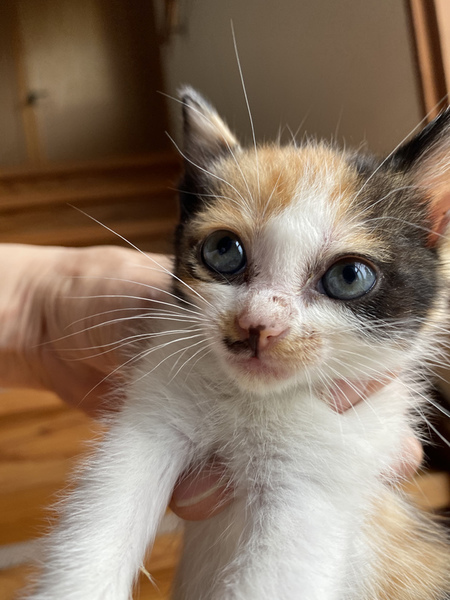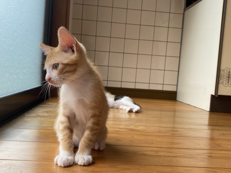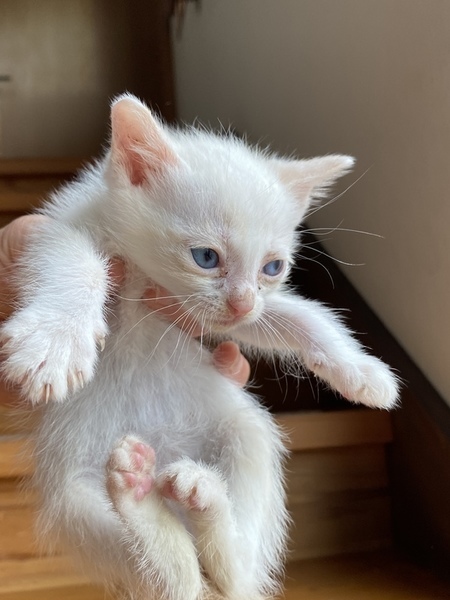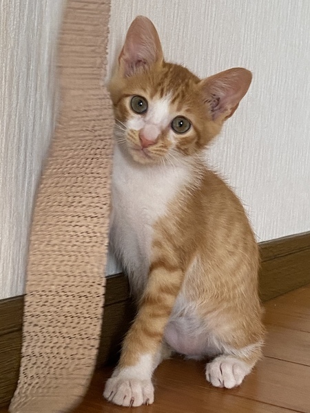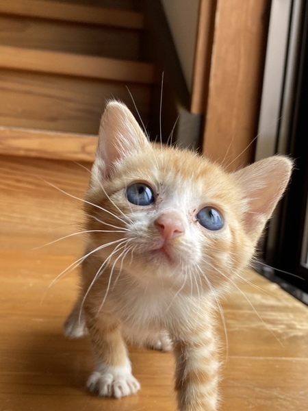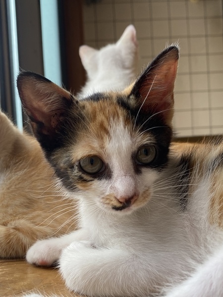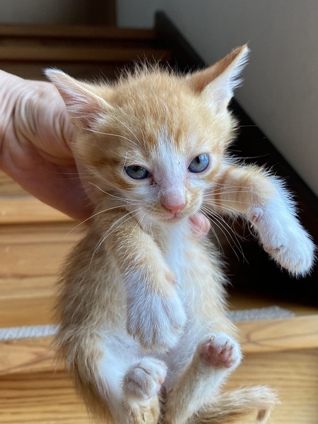 | 特徴(性格など) | 濃い茶トラ オス、ロイヤルミルクティみたいな茶トラ オス、ミケ メス、しっぽがベージュの白 オスの子猫たちです。 茶トラちゃんたちは、ブルーアイでしたが、今は、グレーのような淡いベージュが混じった素敵なお色になりました。白は、ブルーアイ。ミケちゃんは、グレーです。 随分元気に走り回れるようになりました。 茶トラの2匹ほ、やんちゃさん。白とミケは、甘えん坊です。トイレトレーニングは、OKです。 |