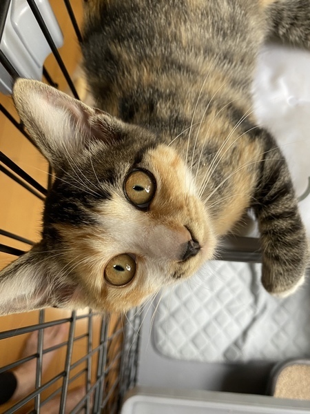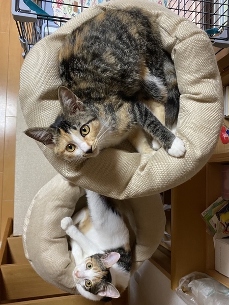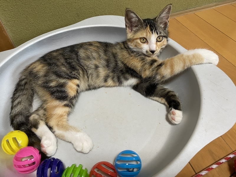 | 特徴(性格など) | 三毛の女の子 ずっとミックスだと思っていたら病院の先生にこの柄も三毛だと言われました 4兄妹ともまっすぐで長いシッポが自慢です よく食べよく遊びます 抱っこして撫でてあげるとゴロゴロします お姉さんの三毛ニャンよりちょっと控えめです 保護猫ですがトイレは一回で覚え夜はケージのちぐらまたは他の仔とだんごになって寝ます もと野良ちゃんですが夜泣きもせず大人しくキャリーに自ら入り保護となりました |