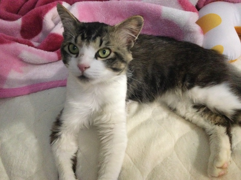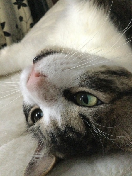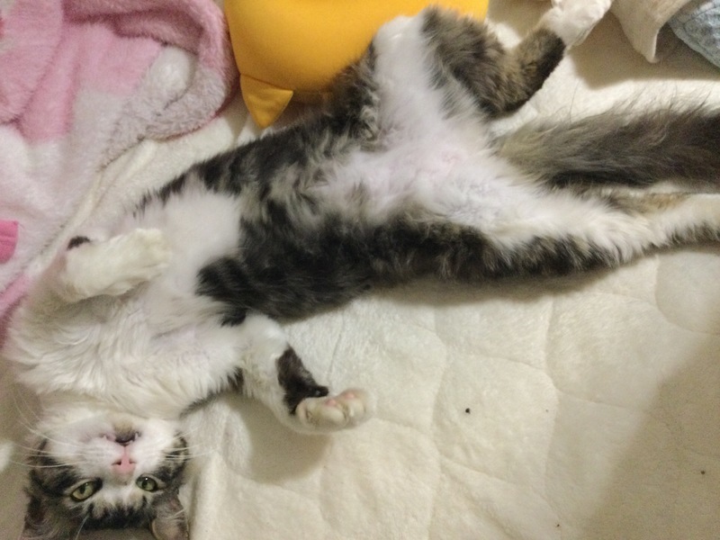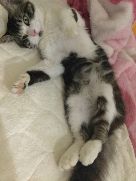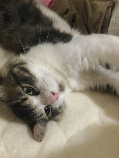 | 特徴(性格など) | キジ白で尻尾ふさふさです。話しかけると『にゃ〜にゃ?にゃーにゃっ』など表情豊かに答えてくれて明るくお話相手になってくれる性格です。ゴロゴロ甘えて来たかと思えば甘噛みをしてもっともっと遊んで!と甘えますが、プイッとどこかに行ったりツンデレが激しい性格です。ふみふみ上手でマッサージの天才☆ | ||