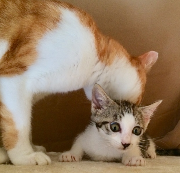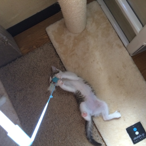 | 特徴(性格など) | 毛色は白サバ?白キジ? 目はキトンブルーの名残りか本来の色か不明ですが、今はブルーグレーの瞳です。 動く物やオモチャに目がないおてんばさんで、元気に転げ回っています。 ママや兄弟から離れ寂しいですが、今は我が家の先住猫さんに家猫の心得を叩き込まれてます。 |