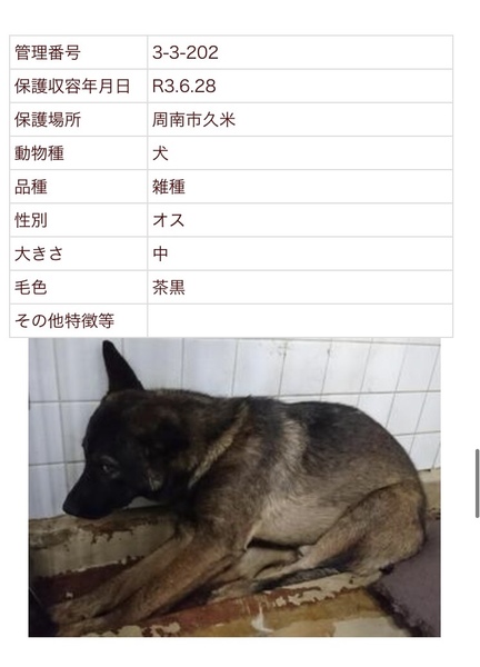 | 特徴(性格など) | 周南健康福祉センター 収容期限 7/6朝迄 管理番号 202 男の子 穏やかな顔立ちのシェパード風の男の子 ただただ人間が怖く怯えています 唸りも威嚇もありません チュールも怖がりながらも食べてくれました |
