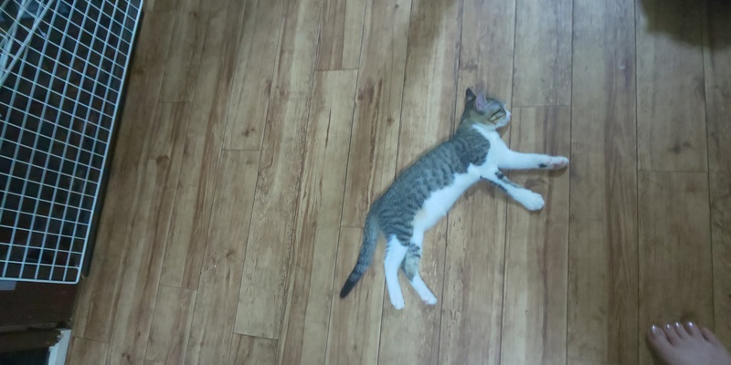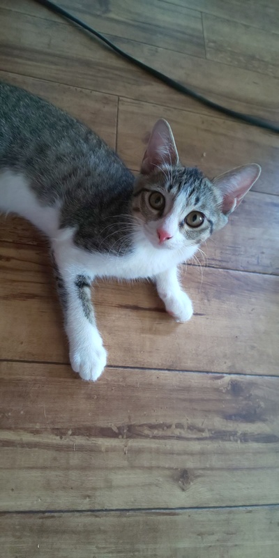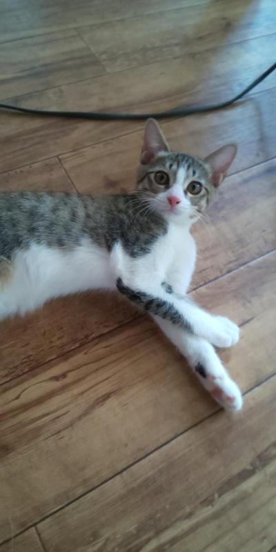 | 特徴(性格など) | 白キジの女の子。とても活発でお転婆さんです。毎日、転がりながら走っています。8月6日現在、生後2.5ヶ月 体重1.2キロです。 | ||