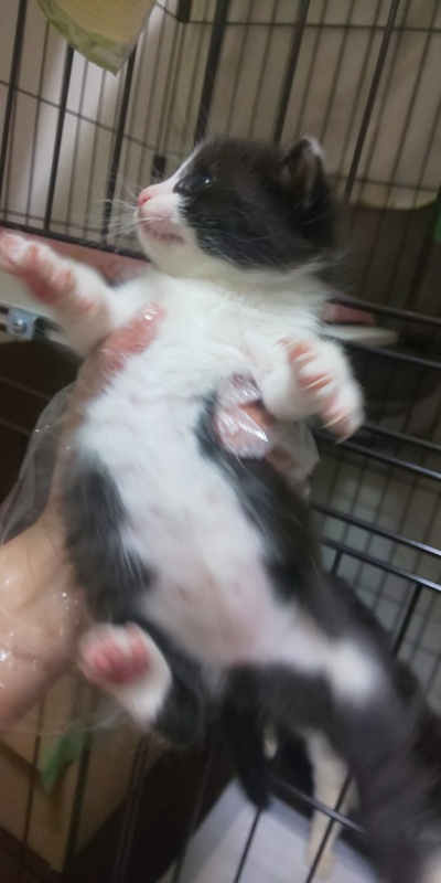 | 特徴(性格など) | 正統派の白黒ハチワレちゃんです。キリッとした顔をしています。我が道を行くタイプで、急に弾けたように遊びます。7月6日現在、生後1.5ヶ月 体重700g前後です。 | ||