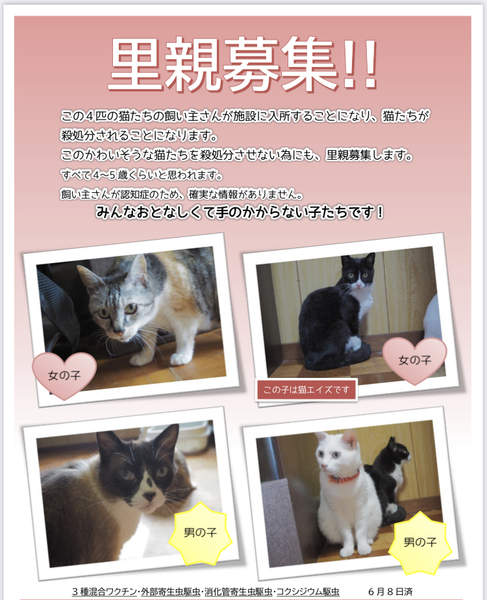 | 里親募集する理由 | 飼い主さんが認知症のため施設に入所することになりました。 そのため、引き取ってくださる方を募集しています。 飼い主さんが認知症のため、猫ちゃんたちこ年齢や食物アレルギーなど不明な部分も多いです。 猫ちゃんたちは、とても大人しく飼いやすい性格です。 |