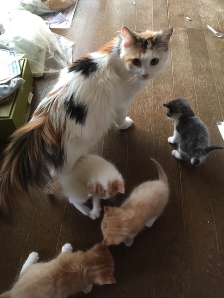 | 里親募集する理由 | 姪が3匹の成猫を飼っています。昨年、オスとメスの子猫を購入、不妊手術が遅れ赤ちゃん猫が4匹、生まれました。姪が生まれた子猫を育てる事が困難なため、叔母の私が里親探しを手伝っています。 | ||