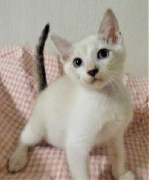 | 特徴(性格など) | 仮名: チェリーちゃん(メス) 毛色: シャムミックス、ブルーアイ、尻尾長い 性格: 人馴れしているので威嚇なく抱っこ出来ます。 抱っこすると甘えん坊です。 兄妹にゃんプロやじゃらし遊びが好きですが、大人猫とはどうか?は今の所わかりません。 兄妹のクリスくんと一緒のお家が希望ですが、別々でも構いません。 暫くは見守りが必要なので、留守番時間は短めのお家が良いと思います。 |