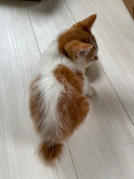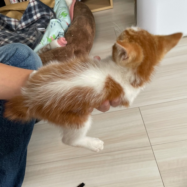 | 特徴(性格など) | 仮の名前:ボブちゃん オス2-3ヶ月 茶白 とても人馴れしていて、1時預かり先のお子さんとも仲良しです。とても穏やかな性格花丸の男の子です。 しっぽは短いです。 |