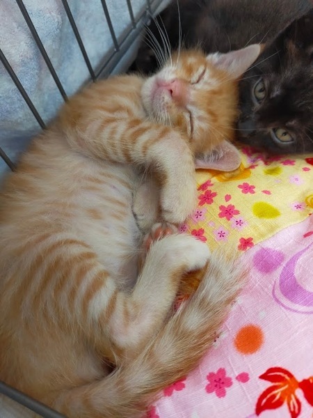 | 特徴(性格など) | 綺麗な毛並みの茶トラオスです。 黒猫メスのしずかちゃんと兄妹です。 どちらも人慣れしています。 二匹でニャンプロして遊んで一緒に寝ています。 仲良しなので、兄妹でのお迎えも歓迎します。 ワクチン一回済み。 血液検査済み。エイズと白血病もマイナス。 |