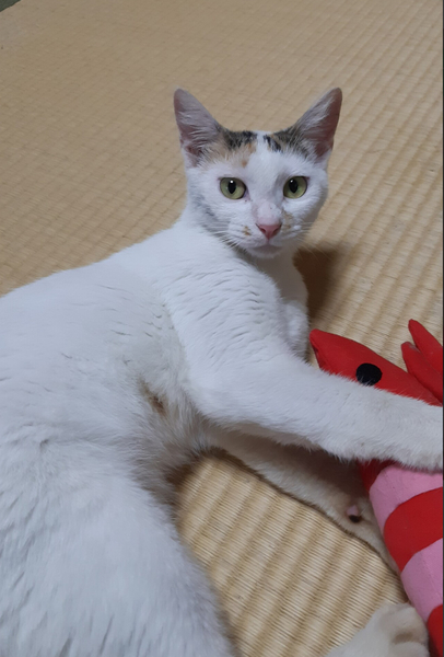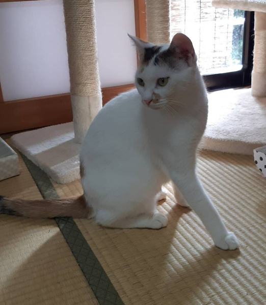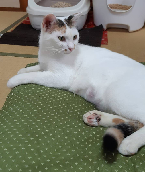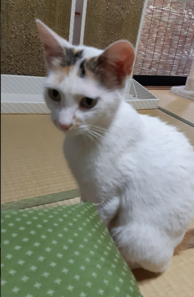 | 特徴(性格など) | 三毛の女の子です。 人が好きで初めての人でもすり寄っていきます。 ノラちゃんだったとは思えないほど人慣れしています。 元々は飼われていたのかもしれません。 甘えるのが大好きですが、しつこく甘えることはありません。 おとなしい子です。 |