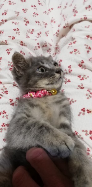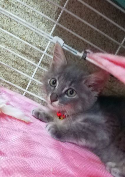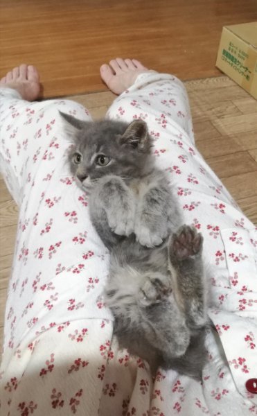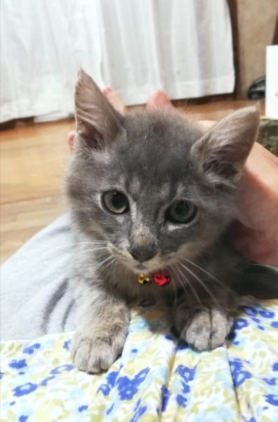 | 特徴(性格など) | ★快食&快便、健康状態は良好です ・エイズ·白血病ウイルス陰性 ・3種混合ワクチン1回目接種済み ・ノミ·ダニ駆虫済み ・検便チェック済み 全身がグレーで縞模様が入ったブルータビーの毛色です。 この子は耳の飾り毛が長く、全身の毛もモコモコふわふわでおそらく長毛になると思われます。しっぽは3分の1くらいのところで折れ曲がっておりウサギのように短く見えます。 表情を見ていると、なんともかわいいのですが、 独りっ子で母親から離れたショックからか、寂しがりやで新しい環境に順応するまでは夜間泣くことがあります。ケージに閉じ込めるならひどくなることがあるので、自由にしてあげれるお部屋がある方が望ましいです。 また、抱っこしてかまってやると泣き止みますので、当初の数日間はマメにそうしたケアができる方が望ましいです。 保護当初猫じゃらしに見向きもしませんでしたが、最近はネズミのおもちゃでひとり遊びをするようになってきました。 |