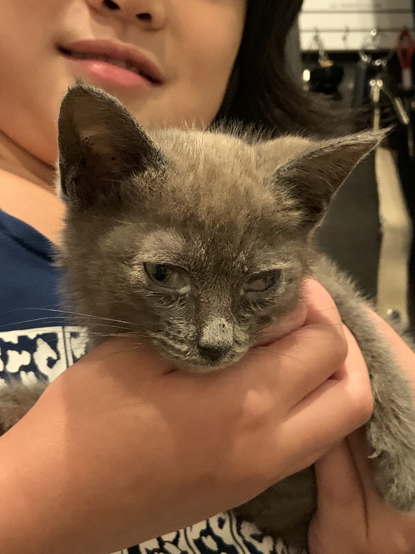| 里親募集する理由 | 娘が道の真ん中から動かない子猫を拾ってきました。我が家には犬やインコなど、先住動物が複数いて、飼えません。 今は風邪を引いて目ヤニがすごいですが、病院に連れて行って、風邪薬の注射を打って、目薬を処方してもらいました。治ればキレイになるそうです。 愛情をかけて、一生面倒見てくれる里親さんを探しています。よろしくお願いします。 |