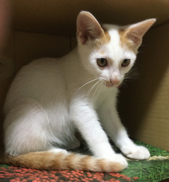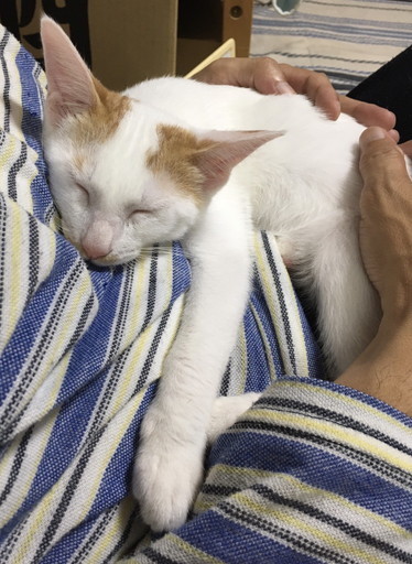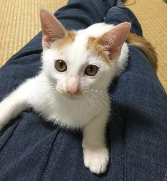 | 特徴(性格など) | 茶白のでまんまる目の可愛い仔です。我が家の猫たちともよく遊び、好奇心旺盛です。 お膝が好きで、眠たくなると膝に来ます。お布団で一緒に寝られます。 甘えん坊でゴロゴロしながらスリスリしてきます。 |