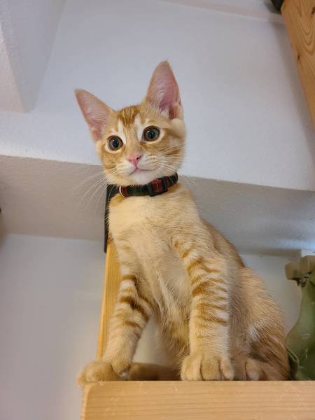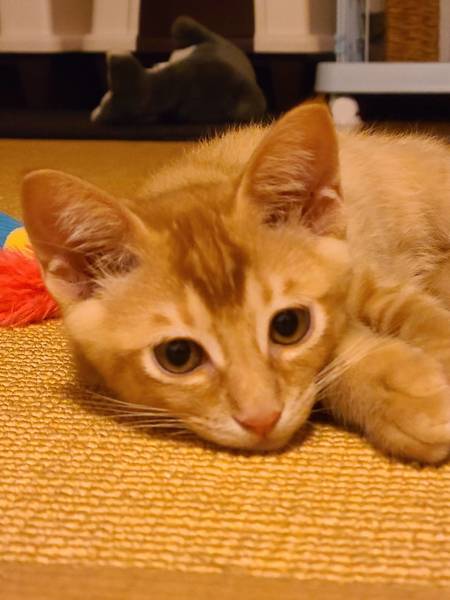 | 特徴(性格など) | 2021.4.7生まれ(推定) 毛色:茶トラ 茶トラで瞳が黄色。尻尾はなが~いです! つぶらな瞳で見つめられるとメロメロです♡ とてもやんちゃ坊主&好奇心旺盛。 そしてとても甘えん坊でゴロゴロいいながら顔を寄せてきます。 食慾バッチリ、運動神経抜群! たくさん遊んであげて下さいね♪ |